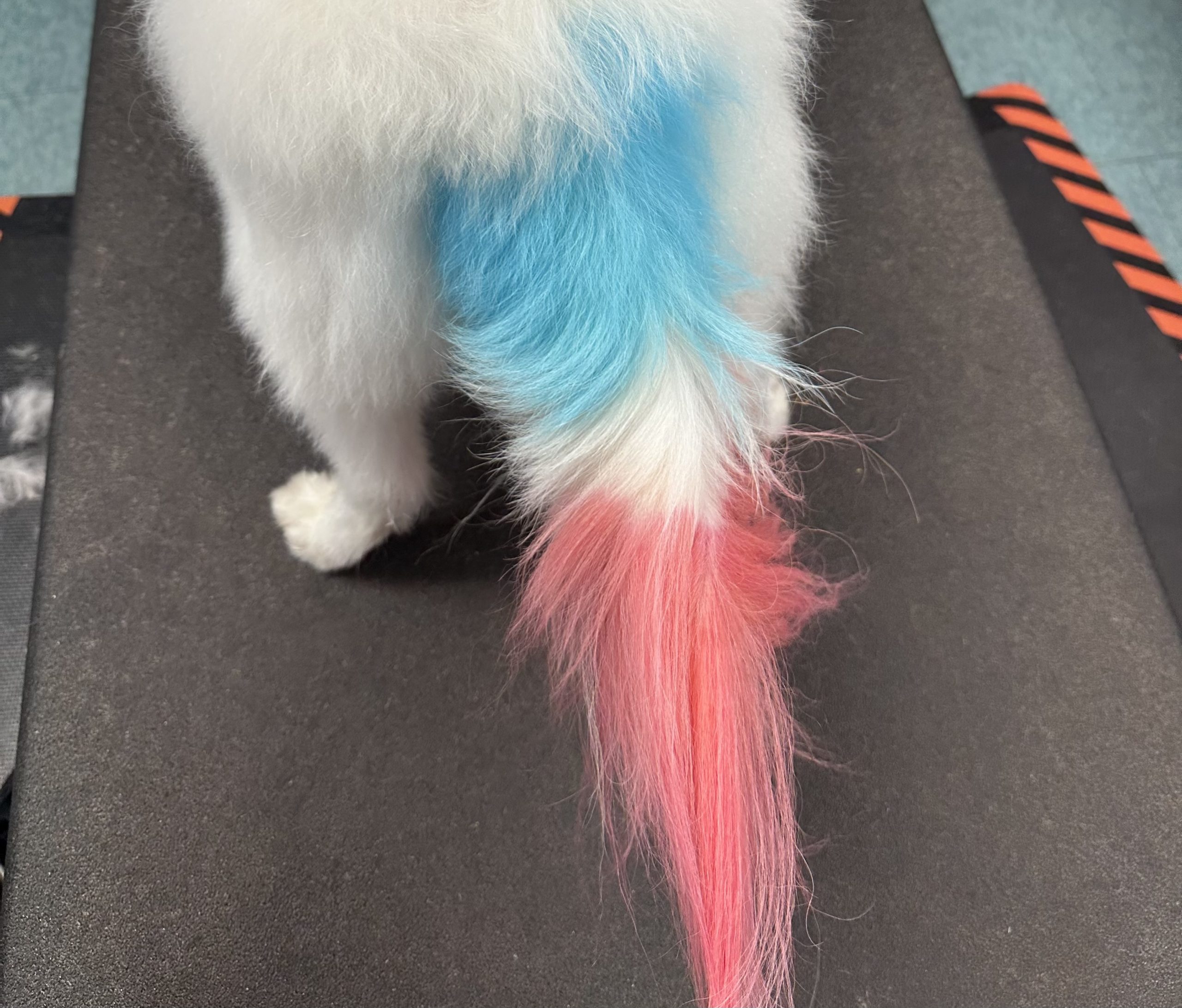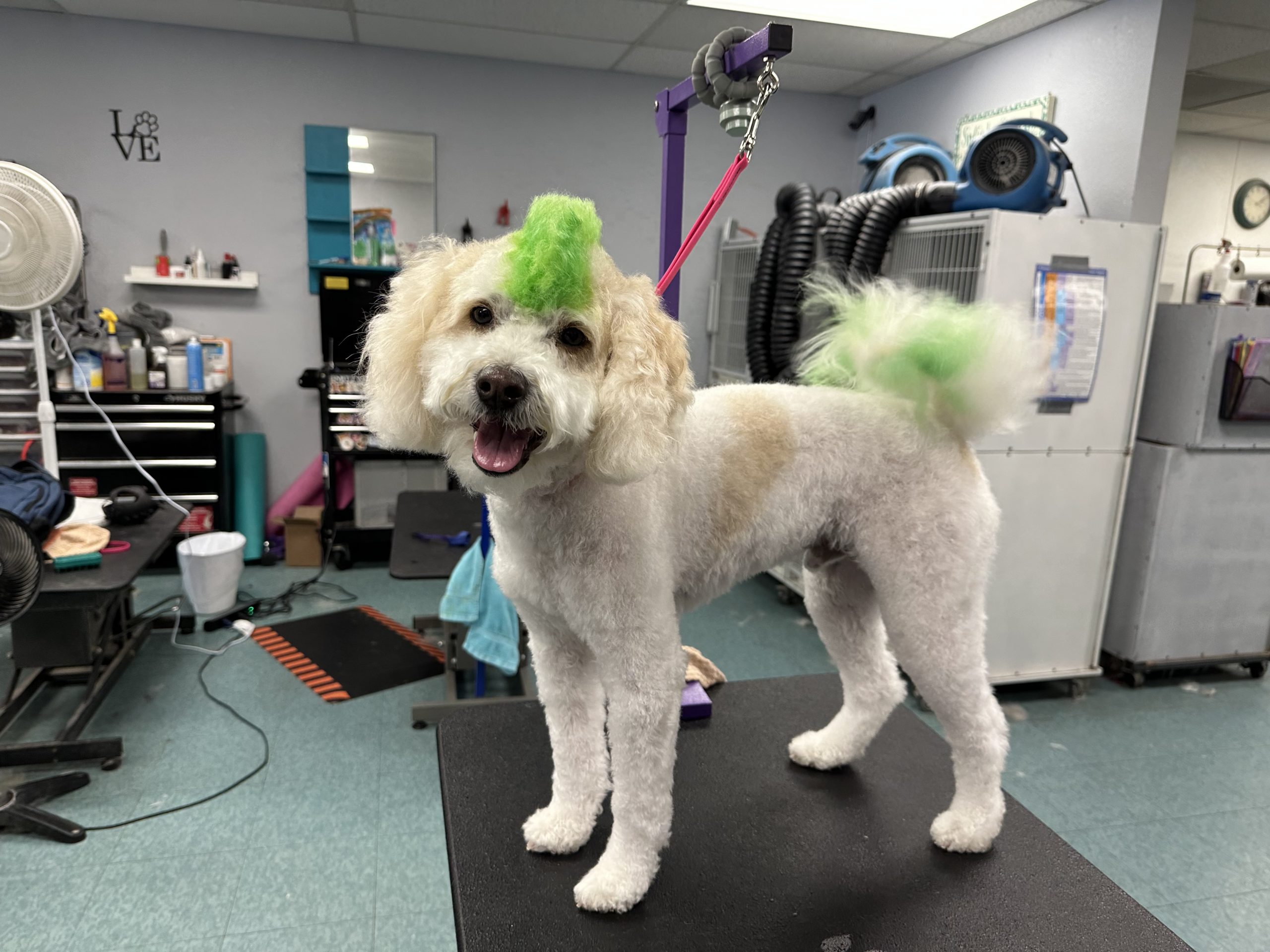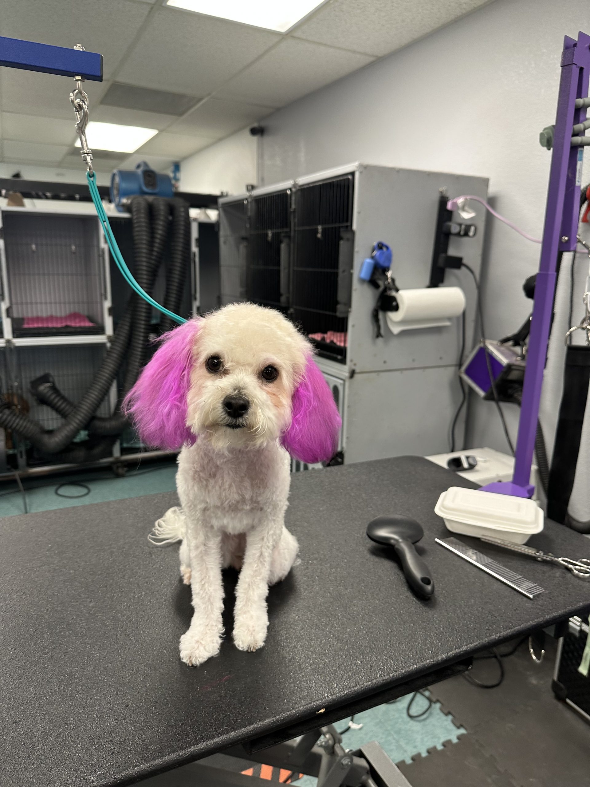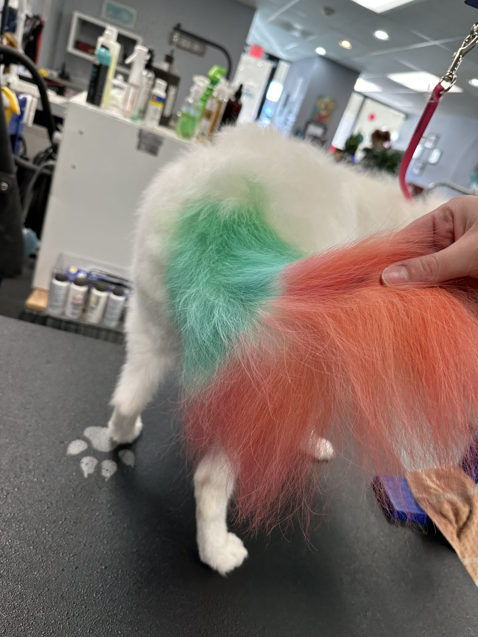 Creative Grooming- Pet-safe, vibrant dyes for creative accents or full designs. Pricing varies by based on design, coat length, and size. For safety, this service is available only to current clients whose behavior and coat we’re familiar with. Please call for more information.